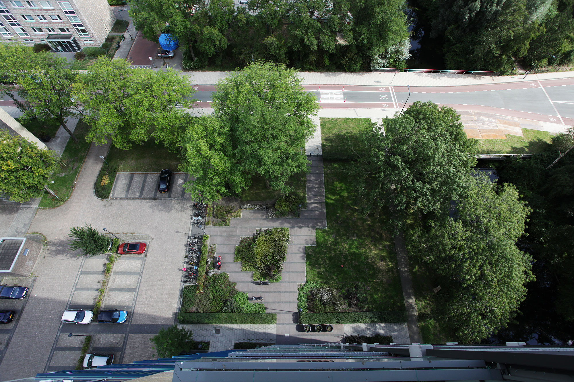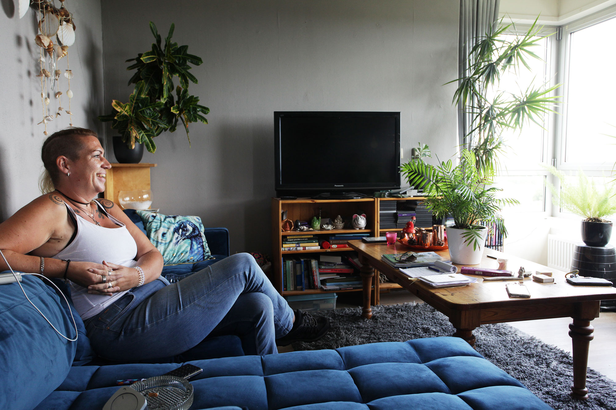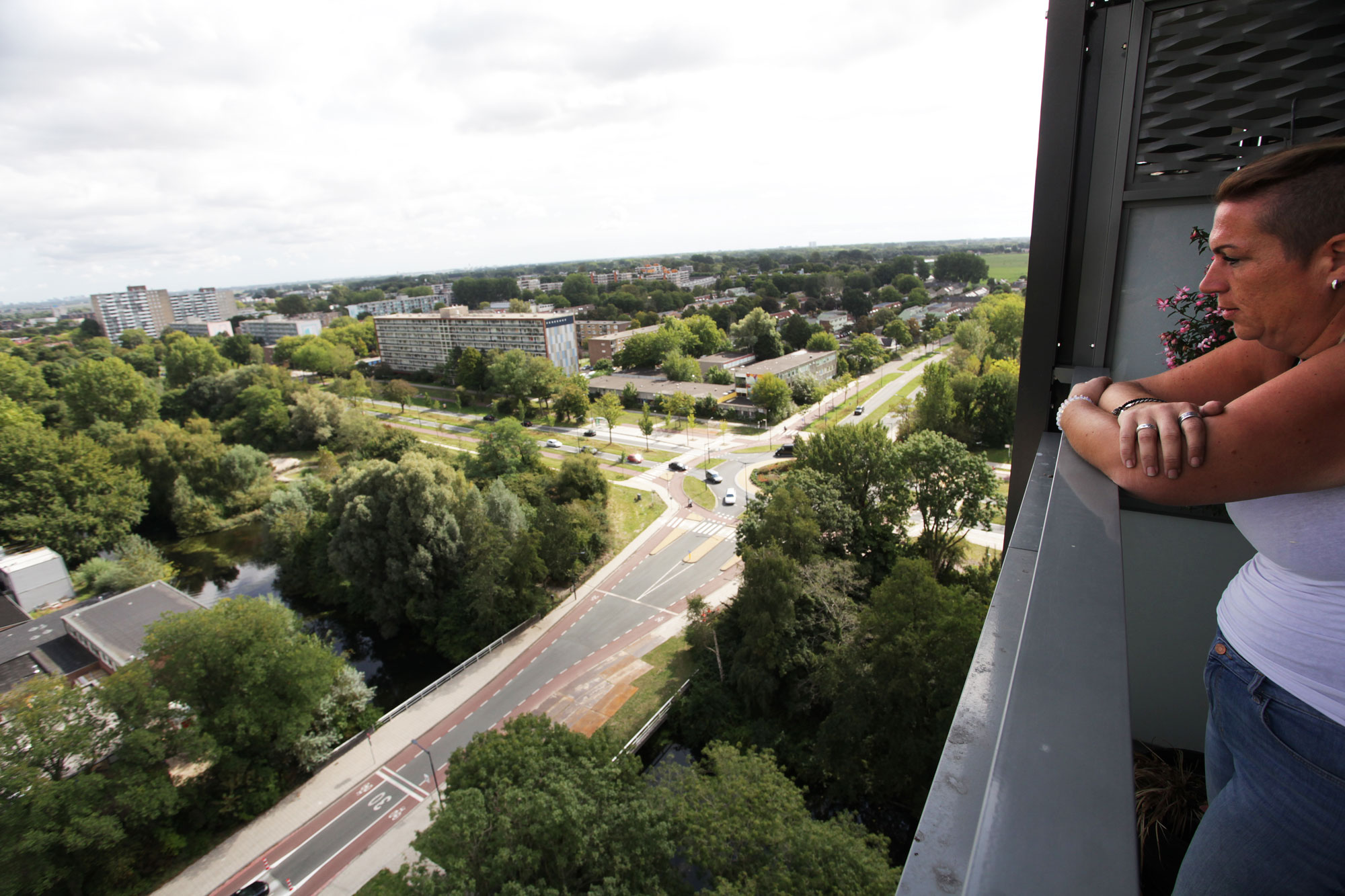 “Jazeker, de wind kan behoorlijk tekeergaan. Daar moest ik wel aan wennen in het begin. De flat beweegt een beetje mee met de wind. De hanglampen schommelen aan het plafond en je voelt het als je loopt. Inmiddels heb ik aardige zeebenen. Hahaha. Verder vind ik het alleen maar helemaal super om hier te wonen. Echt, elke dag weer geniet ik van de ruimte om mij heen en het groen en het uitzicht op de stad. In mijn geest heeft dat ook ruimte gemaakt. Omdat ik zover kan kijken ben ik ook verder gaan denken lijkt ‘t. In mijn vorige woning die laag bij de grond was dacht ik veel aardser.”